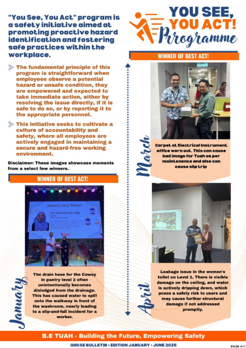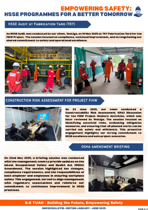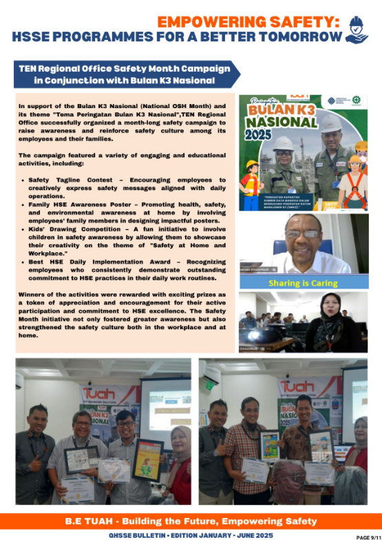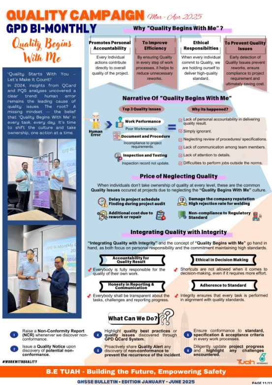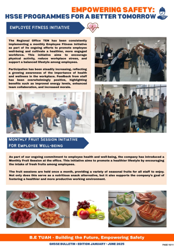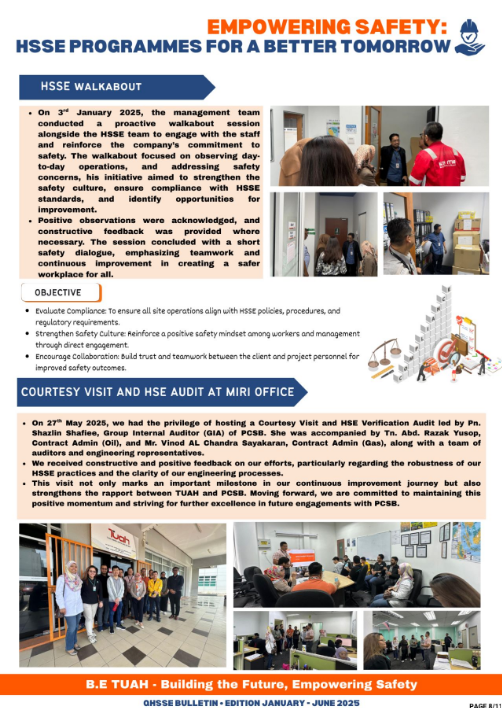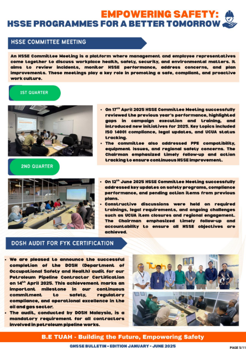We are pleased to announce that the QHSSE Bulletin is now officially live, with its first edition launched in 2025. This publication serves as a comprehensive platform for sharing insights on Health, Safety, Security, and Environmental (HSSE) campaigns, Quality Campaigns, promoting the continuous development of safety awareness across our regional offices, and highlighting key initiatives from our Quality Improvement Program.