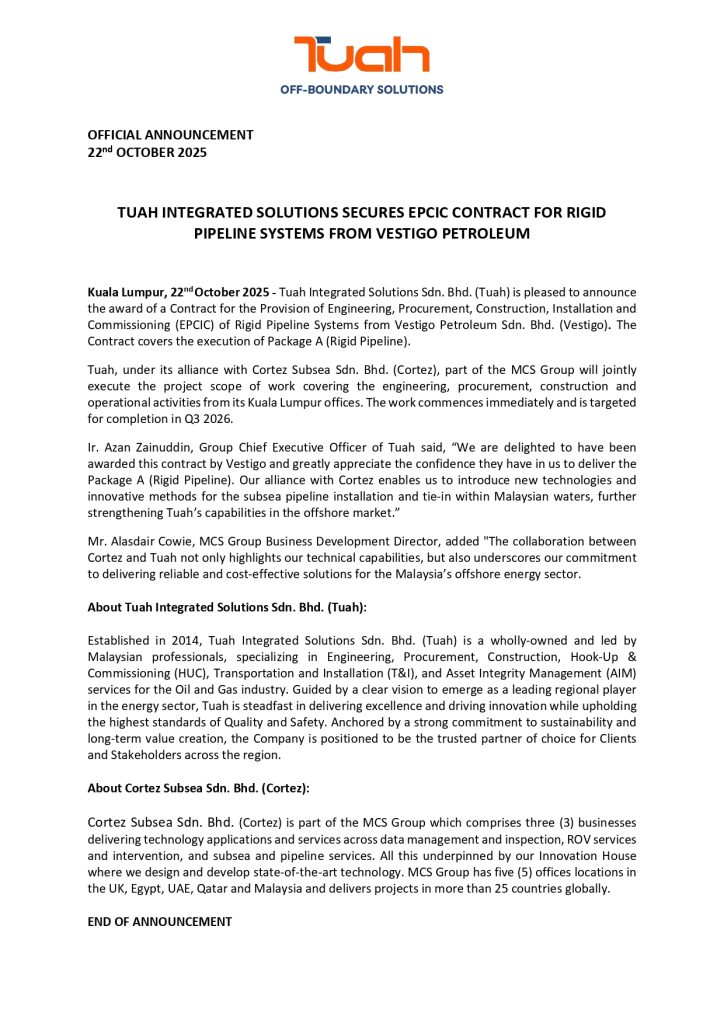 Tuah Integrated Solutions Secures EPCIC Contract for Rigid Pipeline Systems from Vestigo PetroleumBy tuah_admin / October 22, 2025 Tuah Integrated Solutions Secures EPCIC Contract for Rigid Pipeline Systems from Vestigo Petroleum